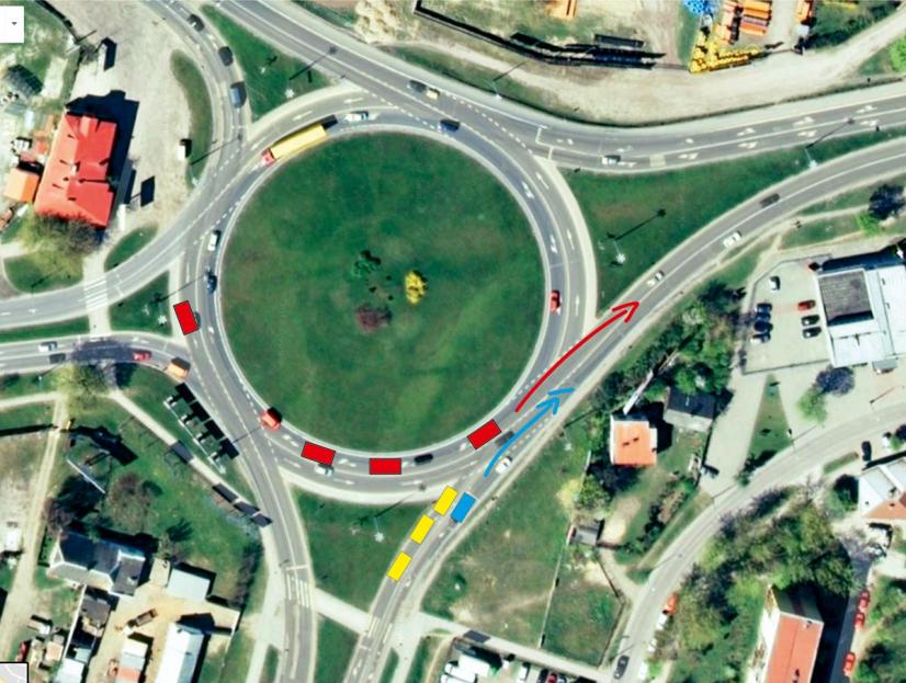 Proszę nie zwracać uwagi na auta ze zdjęcia(satelita google) odnoszę się jedynie do budowy ronda. Sytuację staram się przedstawić na przykładzie kolorowych prostokątów symbolizujących auta.