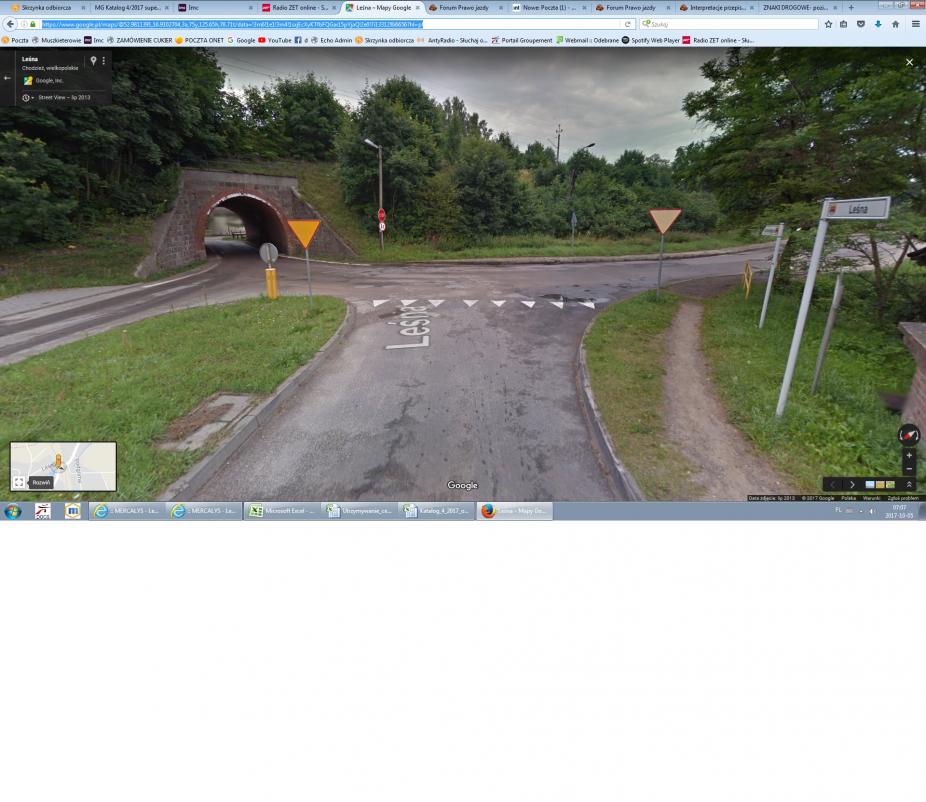 Ostatnio na drodzę napotkałem na skrzyżowanie które wygląda tak: Droga z pierwszeństwem prowadzi pod wiaduktem przy którym znajduje się znak B-20 STOP, druga natomiast ustąp pierwszeństwa krzyżuje się z nią prawie dokładnie w miejscu ustawienia tego znaku i dochodzi pod kątem dzięki któremu w miejscu gdzie znajduje się linia warunkowego zatrzymania na drodzę z ustąp pierwszeństwa, jest dobra widoczność na całą okolicę drogi. Pytanie jest więc takie: Czy jeżeli jadąc drogą z ustąp pierwszeństwa zatrzymam się w miejscu, w którym znajduje się linia warunkowego zatrzymania to muszę zatrzymać się jeszcze raz na drodzę z pierwszeństem ? Czy to zatrzymanie na tej drodzę z ustąp można zinterpretować jako zastosowanie się do znaku B-20 ? Załóżmy że na skrzyżowaniu nie ma żadnych innych pojazdów prócz tego którym poruszam się ja. Dla zobrazowania załączam link do miejsca: https://www.google.pl/maps/@52.98113...2!8i6656?hl=pl Oraz dodatkowo zdjęcie: Kliknij obrazek, aby uzyskać większą wersję